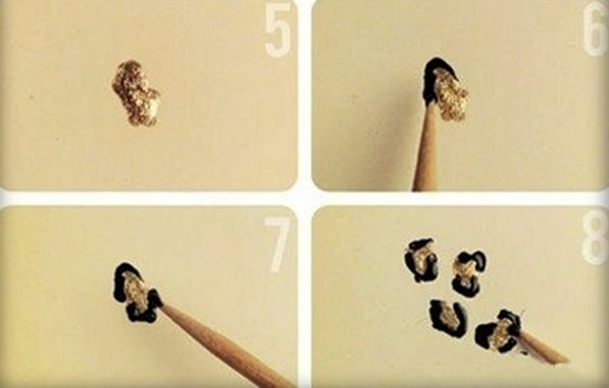 3.将金色的甲油点在指甲上,成不规则形状。开动你的想象力,看起来是不是像一滩水渍。