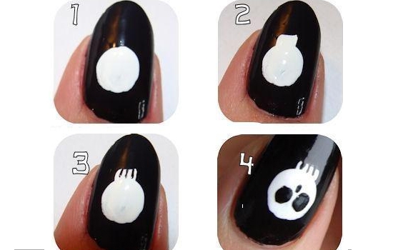 4.白色圆点完全待干后,在圆点上方画两个对称的黑色圆点,并在两个圆点中间的下方画一笔黑色,这样小骷髅的图案就完成了。
