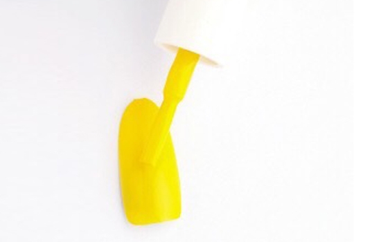 步骤一:将手指洗净打磨,涂一层护甲油。待底油干后,再均匀涂上黄色甲油。