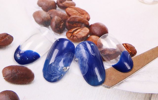 step2.把封层与深蓝色甲油胶调制成较浅的蓝,用小笔沾取后,由中间向下轻刷甲面,清洗小笔后,把颜色往上晕染开,照干后重复上色