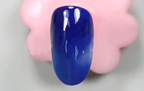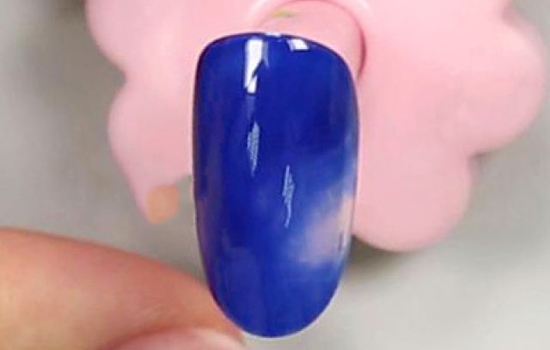 step1.完成底胶后,用深蓝色甲油胶涂刷甲面,注意要在右侧留出一个小空位哦!用光疗笔稍稍调整空位的形状后,用小笔把空位边界的颜色晕染开,照干后重复上色与晕染