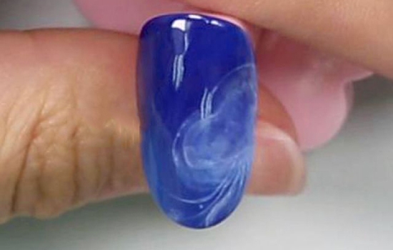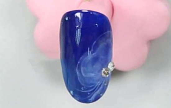 step7.用小笔沾取蓝色彩胶在甲面的前后端边缘随意轻点,点缀画面,照干。最后用光疗胶把钻饰粘在水母身体上,照干后刷上封层即可