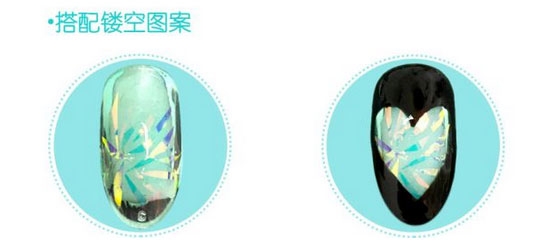 将玻璃铂纸剪成细小的条状贴于甲面中间的位置,画出一个镂空的心形,并涂满周围颜色,是不是迷离又梦幻呢
