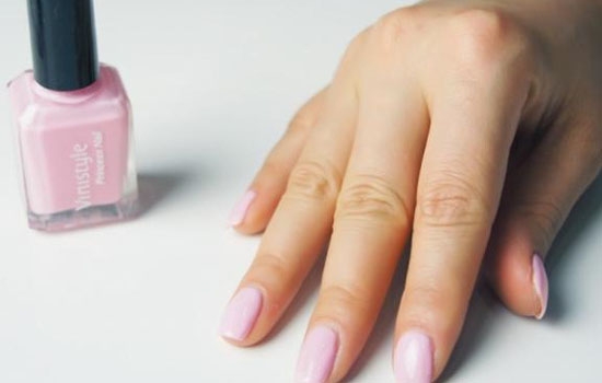 修剪,擦洗,打磨完指甲后,先给指甲上一层护甲油。待护甲油彻底干燥后,涂上粉色底色甲油。