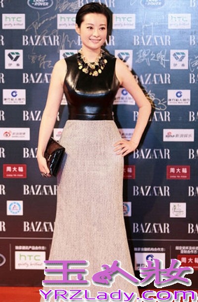 小编点评:紧致修身的皮质背心拼接米色的麻呢长裙,十分优雅高贵!袁立选择了金色的贵气珠宝来装饰,完美演绎出超闪亮的明星动人气质!