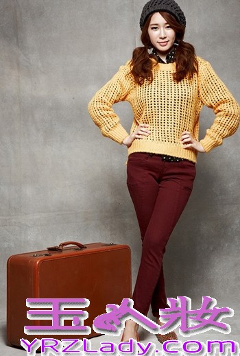小编点评:黄色镂空针织衫搭配深红色九分裤,脚上那一双豹纹平底鞋将小女生温暖与张扬完美结合。