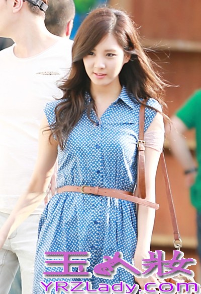 小编点评:少女时代徐贤复古的搭,蓝色点点连衣裙,清新的颜色让原本就很甜美的老小更进一步,简单的搭配棕色腰带和包包,喜欢这么温柔的姑娘么?