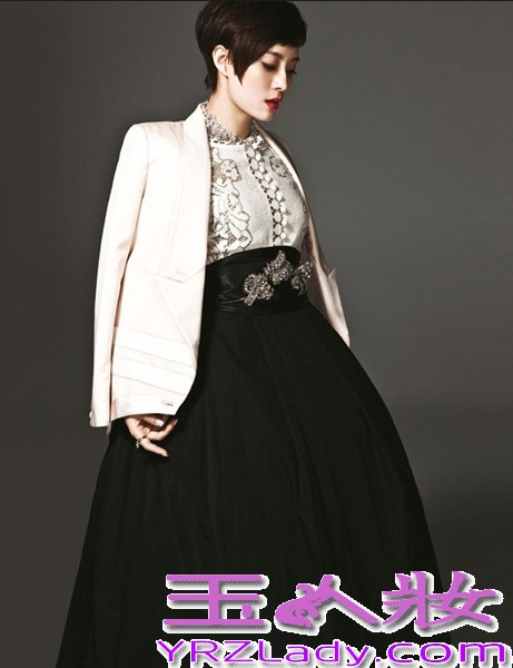 小编点评:一身英国贵妇装,裸色西装套外,泡泡裙展现出女王气场搭配烈火红唇,整个搭配气场不凡。