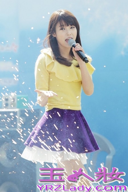 小编点评:IU一身俏丽的装扮,黄色荷叶上衣搭配紫色短裙,清秀的发型展现出清纯动人的一面。