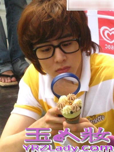 咦,冰淇林上到底有什么东东要拿着放大镜去一窥究竟呢?哈哈,原来是冰淇林上的纹路引起了尼坤的兴趣。黄白相间的POLO衫把尼坤阳光花美男的气质用最简单的搭配展现出来。