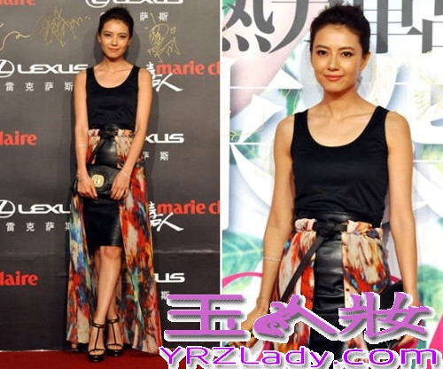 小编点评:高圆圆采用今年最流行的元素印花元素,黑色针织皮质拼接裙混搭迷彩裙摆,时尚个性不失知性的一面。