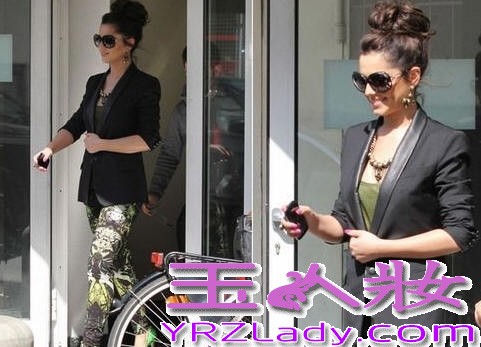 小编点评:Cheryl Cole这条绿色系印花紧身裤,搭配黑色西服外套,很有BOY范哦,墨镜与夸张的珠珠配饰彰显时尚,鲜绿色的蛇纹高跟鞋,潮味十足。