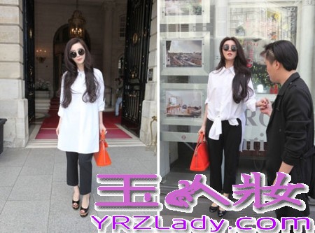 小编点评:纯白的长款休闲衬衫搭配黑色阔脚裤,既可以全部放下来突显优雅休闲范儿,也可以再腰间扎成一个蝴蝶结装饰,突显苗条身材,而且还成功地拉长了全身比例哦,真可谓一衣多穿,十分实用!橙色的大包包也是整套黑白装扮的亮点哦!