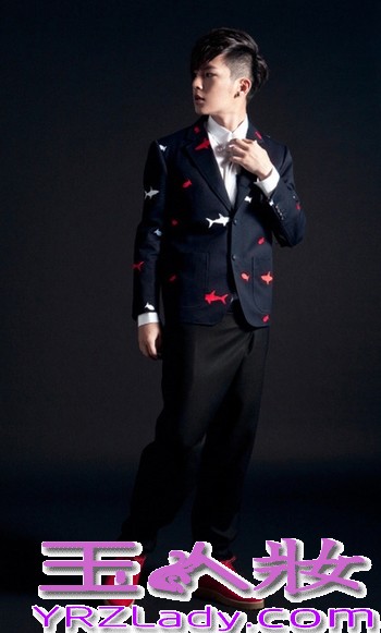 小编点评:黑色西装外套上红白色的鱼仿佛在游动,如此生动个性的服装把炎亚纶的时尚型男魅力展现出来。