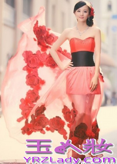 小编点评:章龄之身穿粉红色高腰小礼服,抹胸式的设计衬托出白皙细腻的肌肤,带有一种清新式的性感味道;黑色的小高腰成功拉长全身比例,显瘦又显高挑!最迷人的还是那薄纱裙摆上随风飘逸的玫瑰花图案,衬托出浪漫甜蜜的新婚幸福感觉!