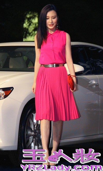 小编点评:一袭艳丽的玫红色连衣裙妩媚而妖娆,银亮的腰带轻松打造出流行复古的小高腰感觉,百褶的裙摆设计修身又复古,搭配流行的鱼嘴黑色高跟鞋,时尚而美艳!
