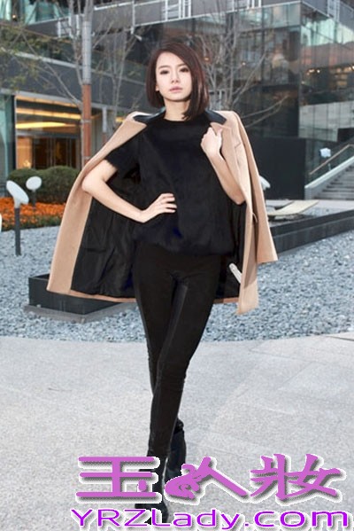 小编点评:黑色短袖上衣搭配黑色紧身裤,搭配裸色风衣,撞色效果极佳,一派都市女强人的造型,气场十足。