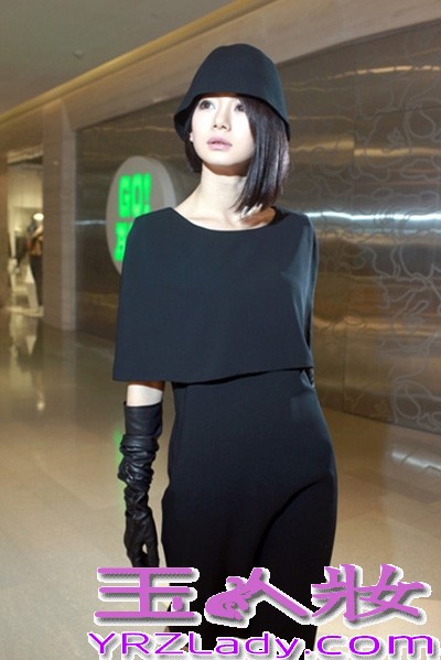 小编点评:黑色连衣裙,上身的假体罩衫,头戴黑色时尚帽子,手戴黑色皮质手套,冷艳气质尽显。