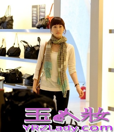 小编点评:一件再平凡不过的长袖白色T恤,搭配上淡淡的英格兰学院风格纹围巾就能起到画龙点睛的作用,很韩系的搭配哦。