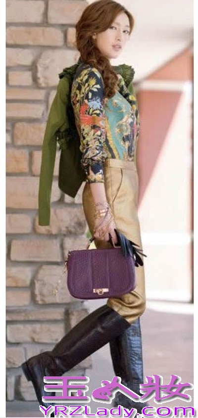 小编点评:复古印花衬衫搭配金色长裤,脚踩黑色长靴。简洁中带着尊贵贵族的气息,内敛而不张扬。