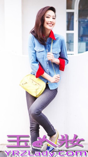 小编点评:休闲的牛仔衬衣,红色的袖口和领子潮范浓厚,搭配深色的牛仔裤和亮眼的黄色包包,如此撞色而又是那么的和谐。