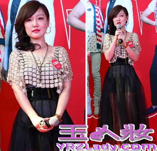 小编点评:薛佳凝米色镂空上衣搭配黑色透视蓬蓬纱裙,宽腰带+ 高跟鞋让她矮个子显高了许多。