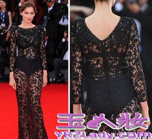 小编点评:蕾蒂西娅-卡斯特身穿Dolce & Gabbana 黑色蕾丝透视长裙,内衣、内裤依稀可见。