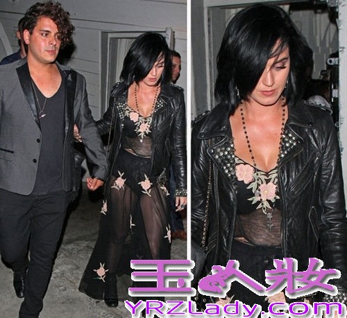 小编点评:凯蒂-佩里,项链和印花铆钉皮衣+短靴内搭飘逸的黑色透视装,朋克风里又带有一丝女人的性感妖娆。