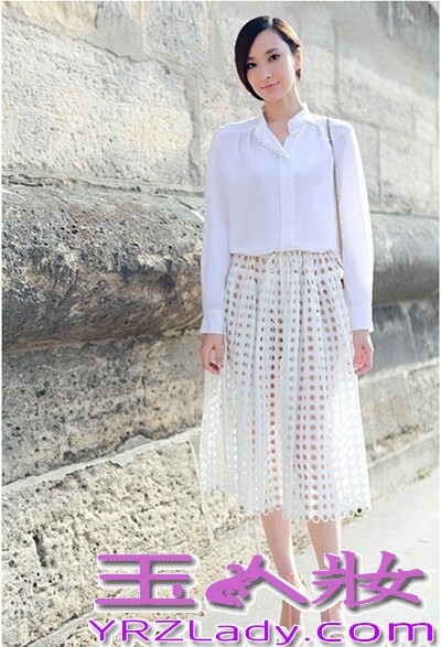 小编点评:白色极简款雪纺衬衣却在衣领中不乏精致细节,镂空半身裙,裸色跟鞋,吴佩慈整体装扮在知性优雅中透着一丝法式风情。