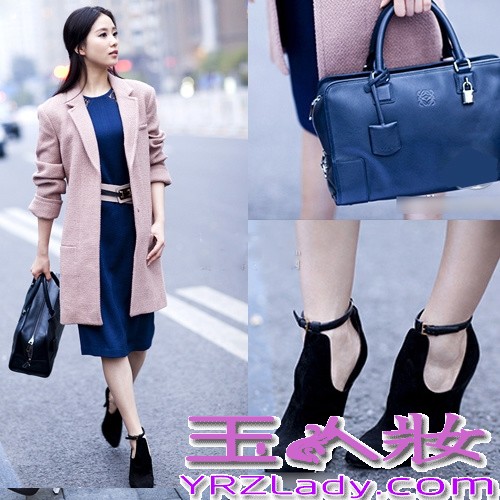 小编点评:古典与休闲主题,刘诗诗的街拍look,粉色毛呢大衣简洁优雅,混搭宝蓝色长裙、绒面高跟鞋,甜美不失格调,上班族值得借鉴。