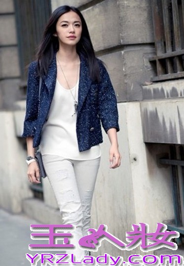 小编点评:有时太追求百搭效果,反而导致衣柜里一水儿的基础款。这时候学姚晨一件织入亮线的外套小西装搭配白色背心和灰色牛仔裤就能点亮整个造型。
