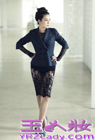 小编点评:赵薇,西装外套+蕾丝leggings,经典的蓝色小西装和诱惑蕾丝打底搭配,性感复古又有型。