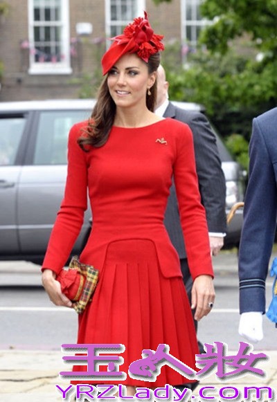 小编点评:凯特王妃红色套装优雅亮相,经典的斜礼帽、及膝百褶裙,王妃在哪出现都一定是焦点。