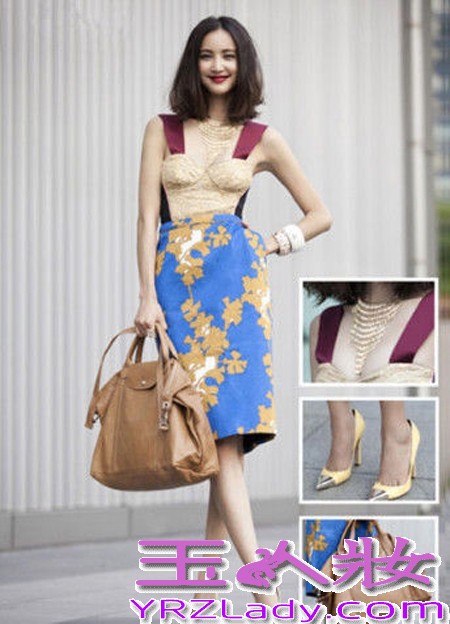 小编点评:上身吊带背心,紧贴皮肤,低胸设计,脖子配戴同色系的项链,纤细的骨感美发挥的淋漓尽致,下身穿搭蓝色印花过膝裙,九头身身材立显。大牌范十足。