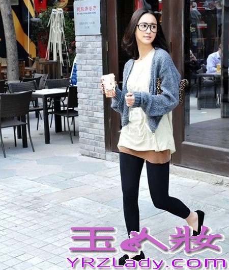 小编点评:蓝色针织开衫内搭配白色T恤,下身搭配黑色打底裤,眼戴黑框眼镜,整体看上去清爽自然,青春飞扬。