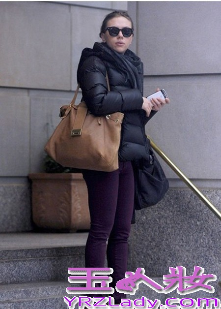 小编点评:头发梳成马尾,黑超墨镜,身着黑色羽绒服,宽松版型的设计,搭配一款同色系的围脖,下身紫色铅笔裤,给人舒适亲和之感哦。