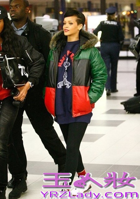 小编点评:帅气短发,突显精致五管,身着三色拼接羽绒服,内搭紫色卡通图案的卫衣,下身打底裤,酷极帅极,保持了一贯的湖人本色。