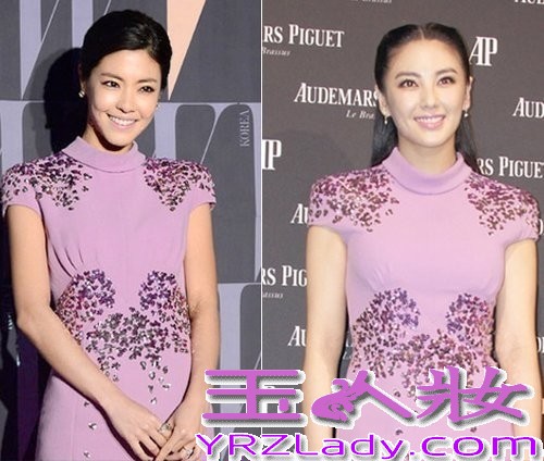 小编点评:张雨绮优雅的公主头搭配紫色的立领旗袍,凸显出小女人的一面,李允智的盘发其实很适合这款粉嫩又优雅的长裙,但还是过于保守了些,且立体感不强啊。