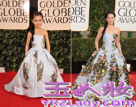 小编点评:华裔女星刘玉玲,在今年金球奖上以一袭印花Carolina Herrera抹胸礼服亮相,甜美的田园气息,友善美好,小童模所穿的小礼服不但花色和款式与她几乎完全相同,麻花辫也模仿的很到位,一样的甜美可爱。