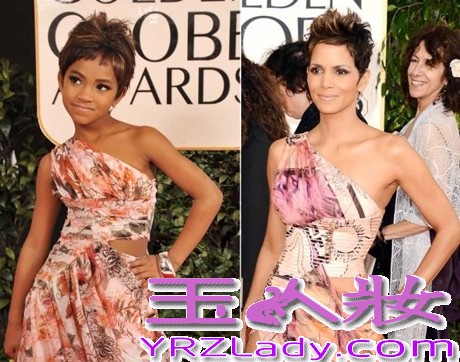 小编点评:柏林和奥斯卡双料影后“黑珍珠”哈莉·贝瑞在金球奖上所穿的范思哲单肩晚装,大气时尚,小童模身上那件“山寨”版的印花礼服同样模仿到位,黑白分明的大眼睛和可爱的容貌,和那自信的神态,让人心生爱怜。