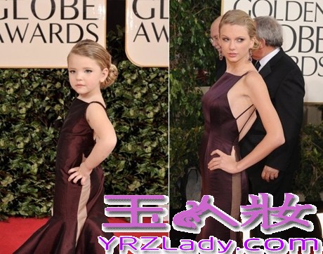 小编点评:乡村小天后泰勒·斯威夫特身穿酒红色Donna Karan Atelier鱼尾裙走上金球红毯,小童模不但照搬了她的服装和发型,圆嘟嘟的婴儿脸和胖胖的小手臂,真是可爱。