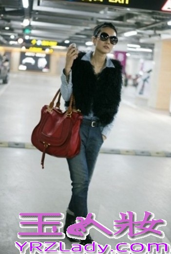 小编点评:高圆圆手拎Chloe Marcie手袋,通身牛仔搭配黑色皮草马甲和军旅靴和简洁的黑色腰带,显得她帅气十足, Marcie手袋的自然、简洁、柔和的包身线条让整身装扮摩登感更强。
