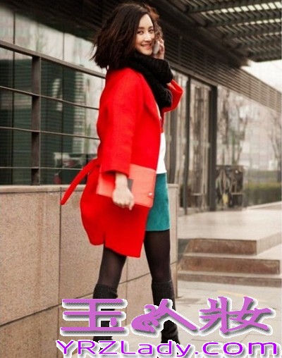 小编点评:张歆艺一件红色呢外套,内配短毛衣+短裤+红皮鞋,非常喜气。
