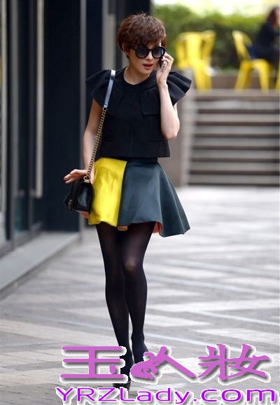 短发搭配灰色墨镜,干练青春。黑色套头衫,蓬蓬袖设计,突显出俏皮感,黄灰两色系的小短裙,个性潮味十足,一双高跟鞋收尾恰到好处。