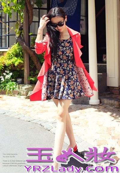 小编点评:连衣裙搭配风衣很是大牌,西瓜红的风衣在春季穿着很清新,吸晴范,里面搭配一款碎花连衣裙很显瘦,西瓜红的单鞋,更是和风衣相呼应,这样的搭配怎么能让人不喜欢呢。