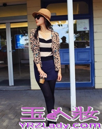 小编点评:豹纹针织小外套,豹纹是永远都走在时尚尖端的,能够尽显出女生的气质感,搭配条纹拼接连衣裙,黑色丝袜和黑色平底鞋,草帽,春天旅游约会是很好的选择,很有风情感。