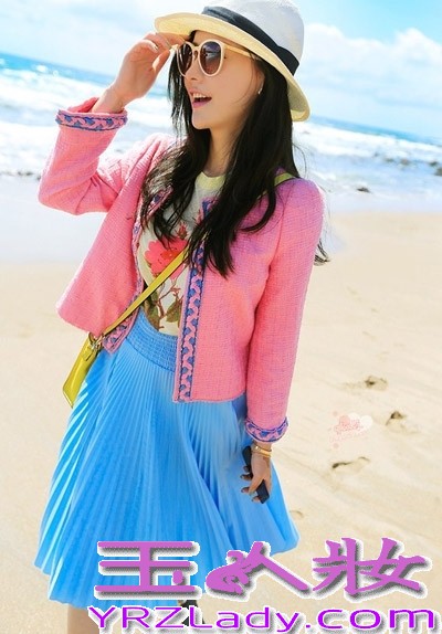 小编点评:粉色搭配天蓝色撞色很亮眼,去到海边很应景。粉色的小香风短外套,简单且随性的款式,穿在身上很显高挑感。搭配印花的T恤,下穿天蓝色百褶雪纺短裙,飘逸唯美的感觉,就像从画里走出来一样。