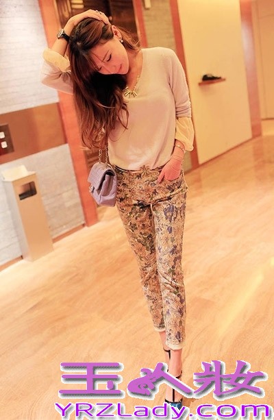 小编点评:淡紫色的喇叭袖T恤款式,下面搭配印花紧身裤和蓝色的尖头高跟鞋,把上衣扎进裤子里显瘦很有范,简单的搭配尽显出欧美范,时尚潮流穿搭,单肩背的一款香奈儿紫色包包带着御姐范。