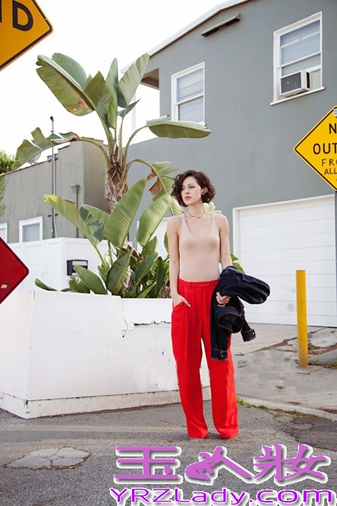 干练混搭:短发造型干净利落,裸肤色背心帅气休闲,搭配牛仔外套合谐经典,下身混搭一条鲜亮西瓜红阔腿裤,精致华丽的干练特质被彰显的淋尽致,让人移不开眼哦。
