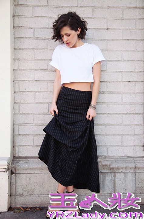 帅气休闲搭配:短卷发、白色短袖T恤、竖条纹的高腰长裙,混搭出休闲帅气的唯美感,T恤短款设计,与裙身距离5英寸,露出纤细小蛮腰和细腻肌肤,熟女的性感姿态一览无遗,黑色高跟凉鞋做为配饰的显高点缀法非常到位。
